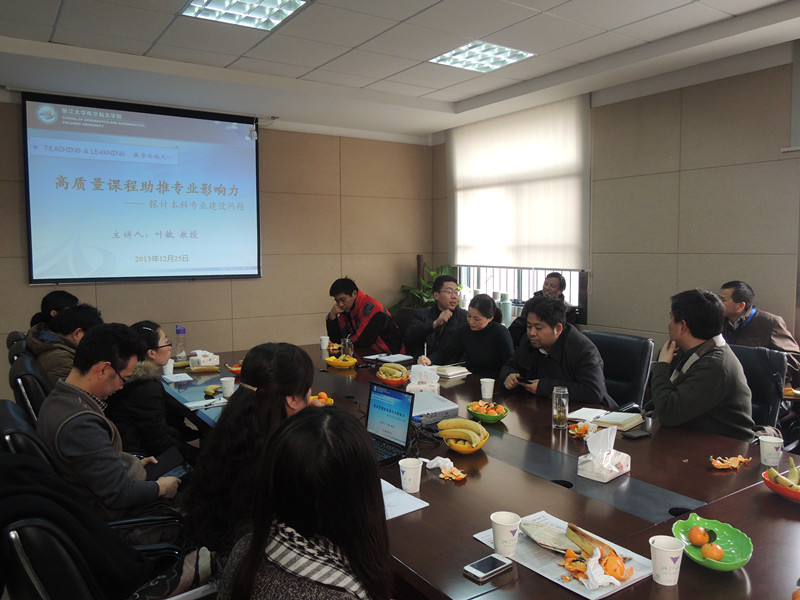 2013年12月25日中午,航空航天学院“教与学”系列教学论坛在玉泉校区第五教学楼326会议室首次举行。论坛以主题发言和自由讨论相结合的形式进行,首次论坛邀请了工程力学系叶敏教授作题为“高质量课程助推专业影响力——探讨本科专业建设问题”的主题发言,全院30余名一线教师参加了本次交流。