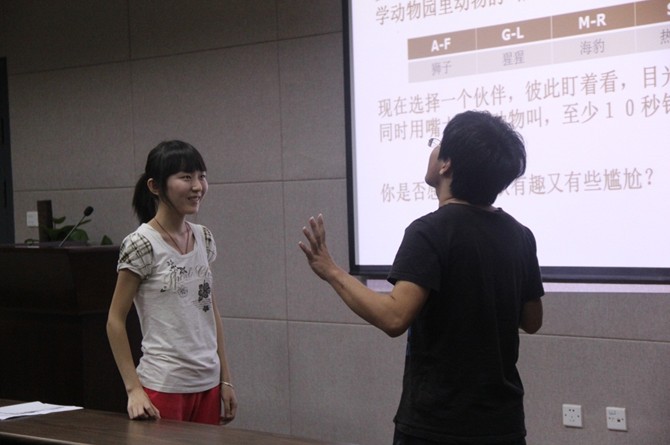 本次班会以游戏为线索展开,新生们则很容易快速融入班集体中。首先,第一环节“名字连连串”拉开了班会的序幕。新老生通过串接所有人的名字和年级开始初步的认识与交流;随后通过挑战创新思维和提高沟通能力的“情绪大挑战”和“指鹿为马”等游戏(图1),由老生先示范体验,然后带领新生一起加入,逐渐推进游戏难度和趣味性(图2),使班会主题得到了极好的诠释。