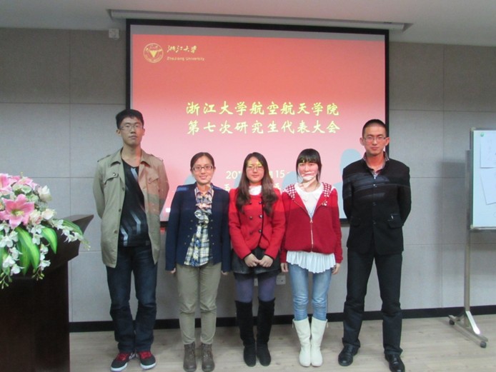 在激昂的国歌声中大会拉开了序幕。博士生会主席朱美军同学首先介绍了大会的筹备情况。浙江大学研究生会副主席张继元代表浙江大学研究生会致辞,他希望学院研博会进一步加强与学校研究生会、博士生会以及全体研究生的沟通,更加深入地了解学生的需求,更好地成为连接校院、导师和同学们之间的纽带;他同时还预祝航空航天学院第七次研究生代表大会成功举行。