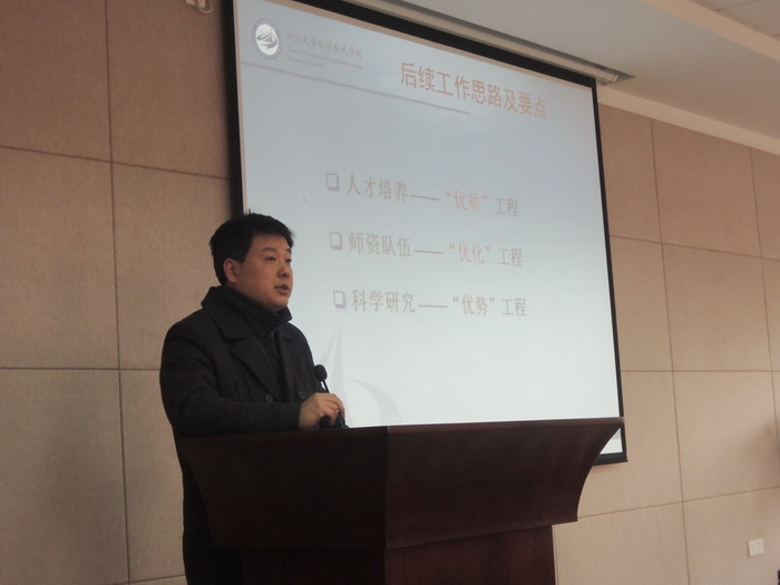 随后,学院副院长邵雪明教授代表学院党政班子向大会作了《践行六高强校战略 推进学院内涵发展》的学院工作报告。他从学院师资队伍建设、教育教学、科学研究、学生工作、党建工作、发展联络等方面总结了学院过去一年来所取得的成绩,并围绕学院如何践行学校“六高强校”的战略举措,在充分调研、总结和分析的基础上,提出了以“三优”工程为主线推进学院内涵发展的后续工作思路,即人才培养——“优质”工程、师资队伍——“优化”工程、科学研究——“优势”工程。学院副院长黄志龙教授和金仲和教授分别围绕人事、研究生培养和科学研究等工作作了专题报告。