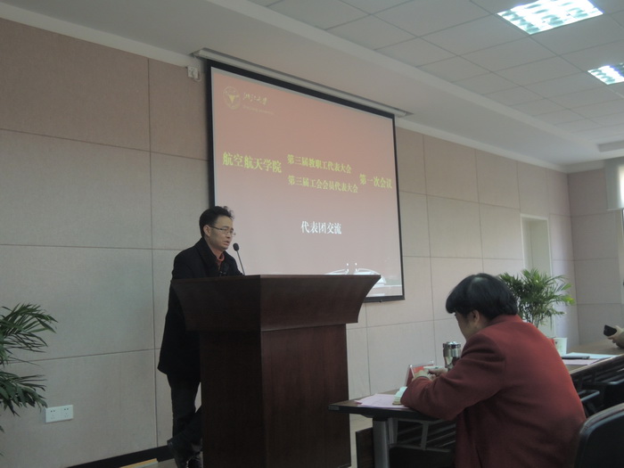 下午,大会分两个代表团围绕学院年度工作报告和后续工作思路、学院生源质量、实验室建设和优化,以及“航空航天学院教学奖励暂行办法(讨论稿)”和“航空航天学院关于结余水电费管理暂行办法(讨论稿)”两个文件展开了交流讨论。与会代表本着对学院事业高度负责的态度,畅所欲言、集思广益,对学院的本科生和研究生培养、实验室建设、民主管理和学院发展等方面的工作提出了很多建设性的意见和建议。下午三点,两个代表团负责人分别在大会上交流分享了各自的讨论成果。