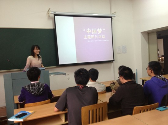 活动的第一个环节是由团支书向同学们简要介绍了党的十八大、十八届三中全会精神,并播放了习近平总书记阐述“中国梦”的视频,同学们认真学习并且不时打断提出自己的问题,这表现出了同学们对于党的发展问题的极大热情。