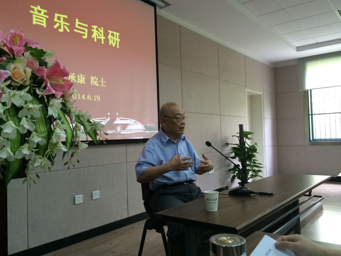 2014年6月19日下午,中科院力学所吴承康院士在玉泉校区教五333报告厅作了题为“音乐与科研”的讲座。航空航天学院党委副书记戴志潜,团委副书记秦婧雅以及各级本科生及研究生参加了此次讲座,聆听吴院士对科研和音乐的独到见解。