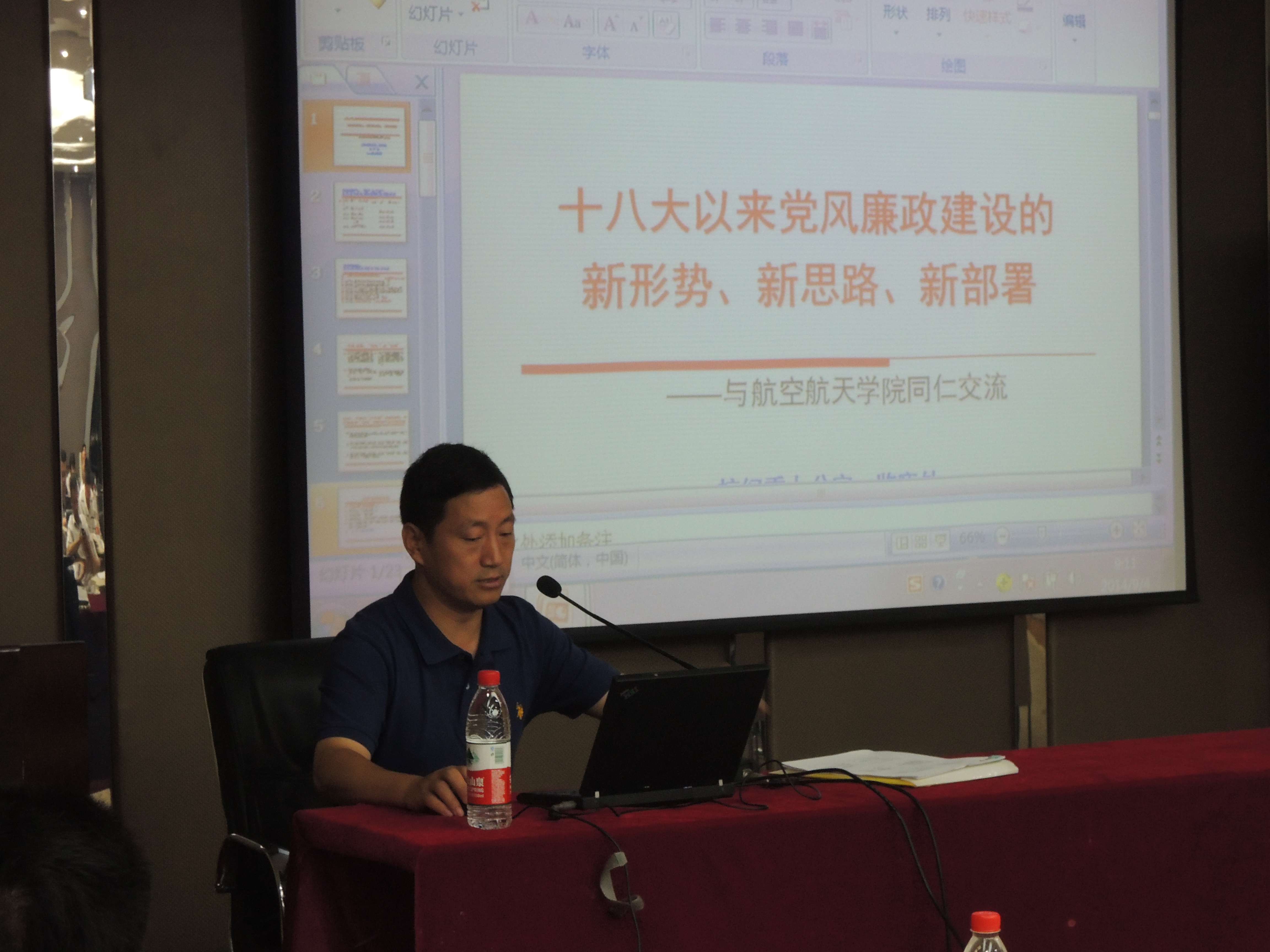 9月4日上午,航空航天学院在玉泉校区永谦活动中心第一报告厅召开党委中心组理论学习(扩大)会议,重点学习中央反腐倡廉相关精神。会议邀请了学校纪委张子法副书记作主题讲座——《十八大以来党风廉政建设的新形势、新思路、新部署》,学院党政领导班子全体成员、教授、研究员、党委委员、纪委委员等30余人参加学习。